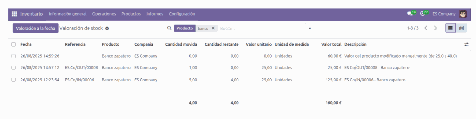 Al modificar el coste estándar, Odoo actualiza automáticamente la valoración de todo el stock disponible.