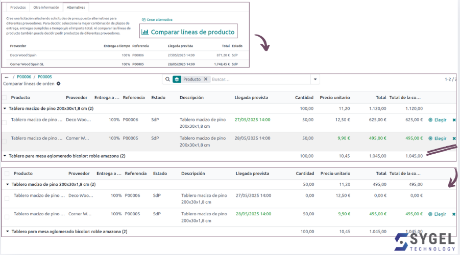 - Compara las líneas de producto. Accederás a una vista en la que podrás comparar todos los precios y fechas de entrega previstas de cada proveedor, agrupados por producto.