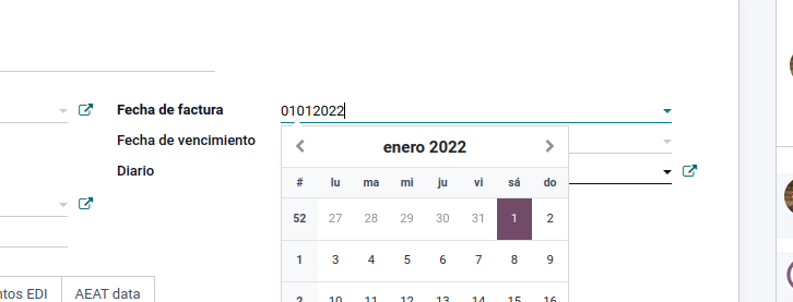De todas formas, Odoo permite escribir la fecha sin estos, de manera que si introducimos la fecha 01012022, Odoo interpreta esta información y lo transforma en la fecha que corresponde. Simplemente, se ha de introducir dicha información y seleccionar fuera del campo. Odoo realizará el proceso de conversión de estos datos.