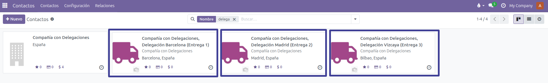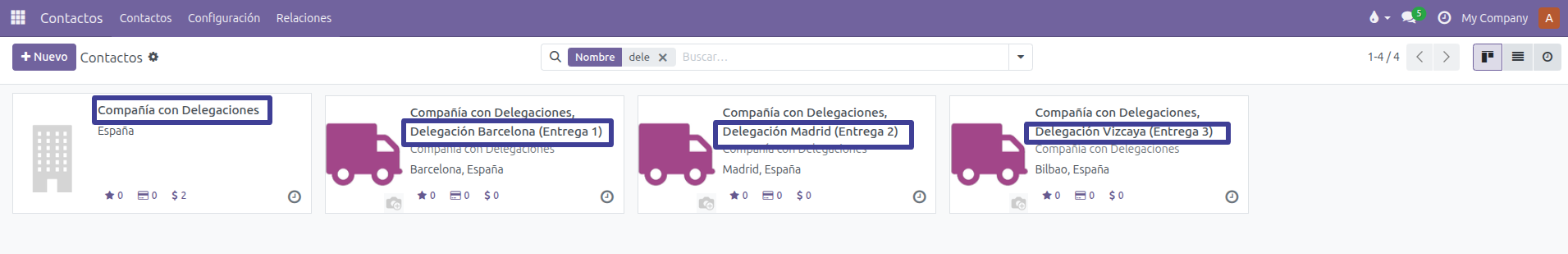 Para trabajar de esta forma, nuestros clientes tendrán una estructura de Contacto Padre, en la cual estableceremos varias Direcciones de Entrega, divididas por Delegaciones.