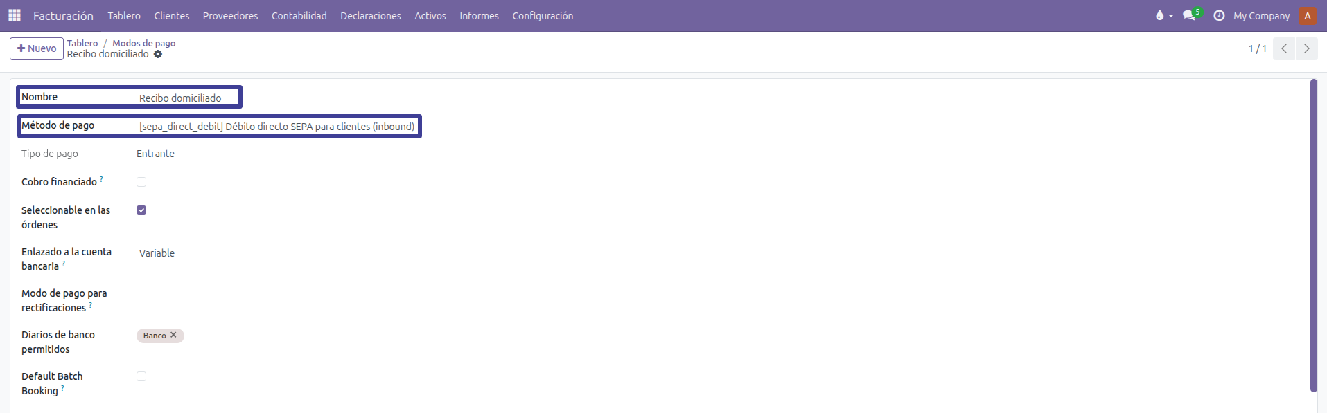 Uno de los requisitos es disponer de al menos un Modo de pago de cliente que utilice un método de pago SEPA, mediante el cual se efectuará el cargo a través del mandato bancario correspondiente.