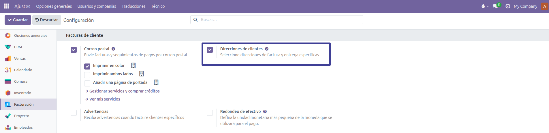 Esta configuración se realiza desde “Ajustes”->”Ventas” ->”Facturación”, y permite elegir:
