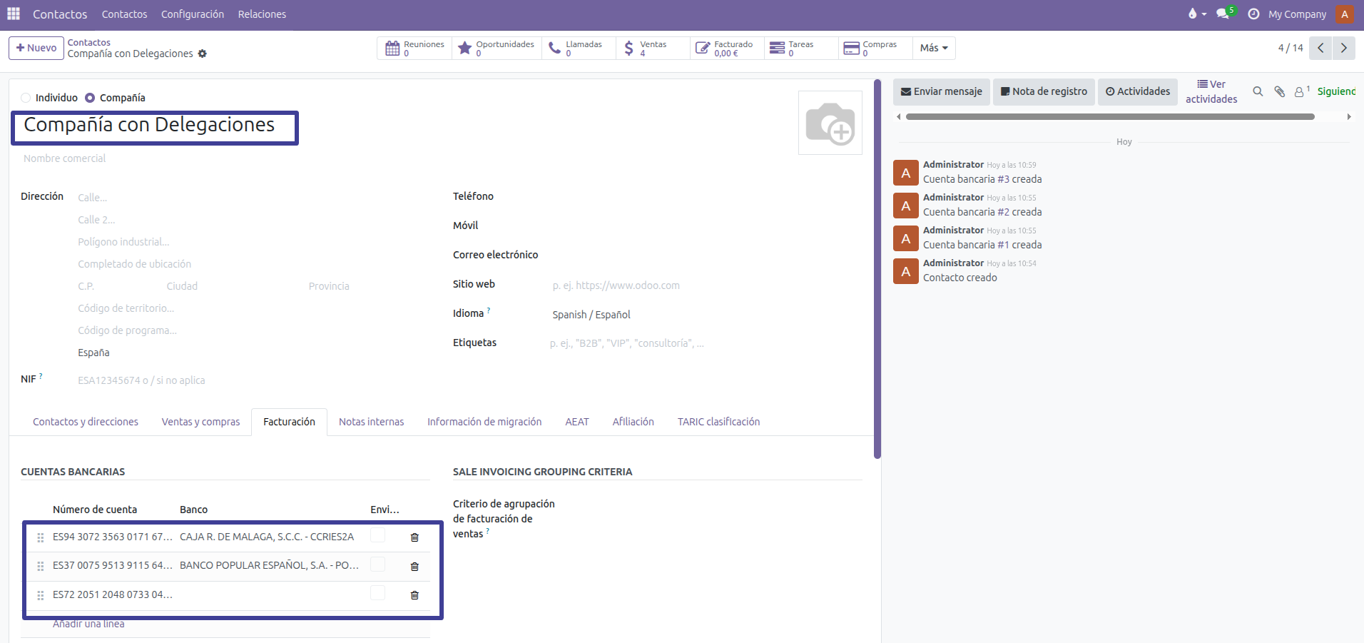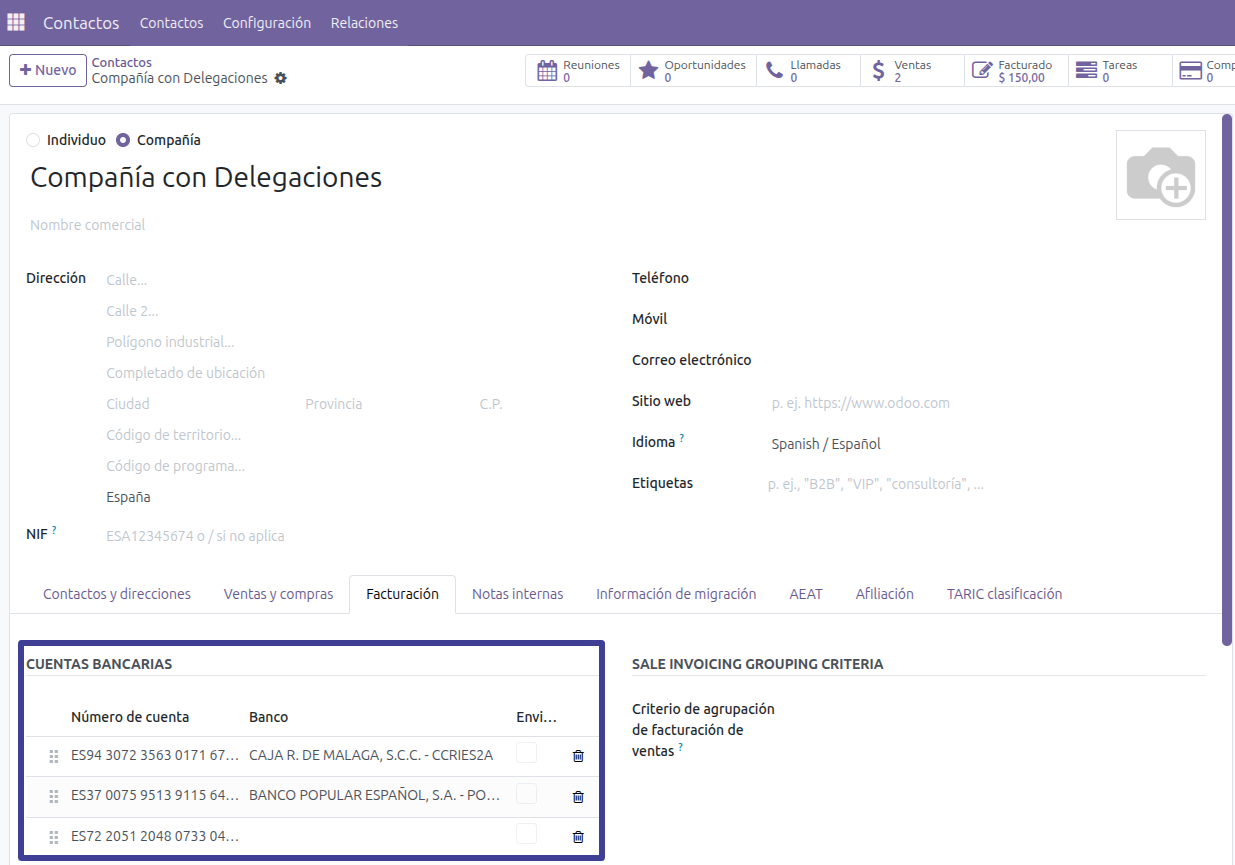 En el contacto Padre estableceremos las cuentas bancarias y los mandatos bancarios vinculados a las mismas: