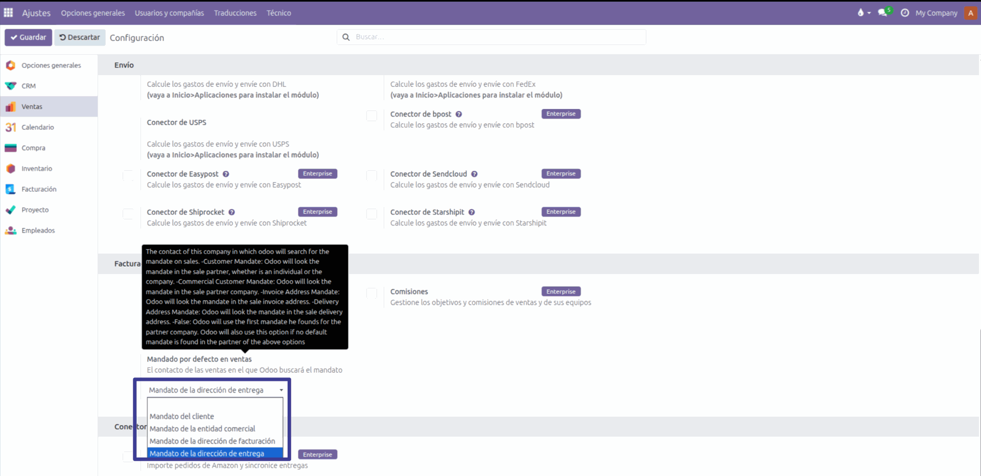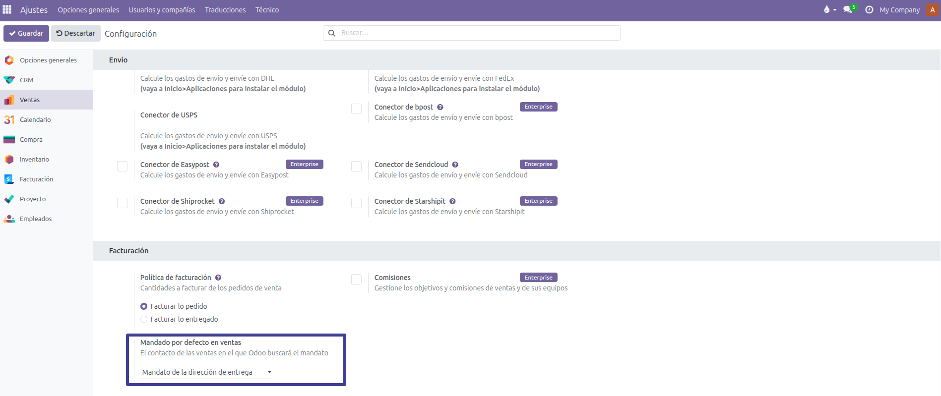 Lo primero que hemos de hacer es configurar la política general del Mandato por defecto en ventas que queremos aplicar en Odoo, en este caso, sería Mandato de la dirección de entrega.