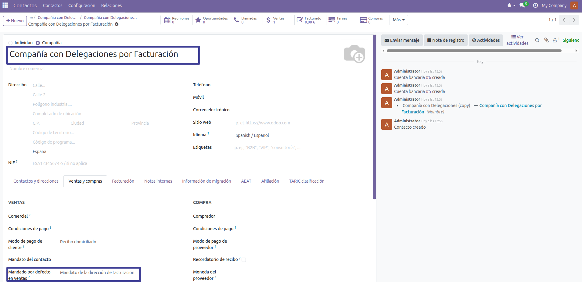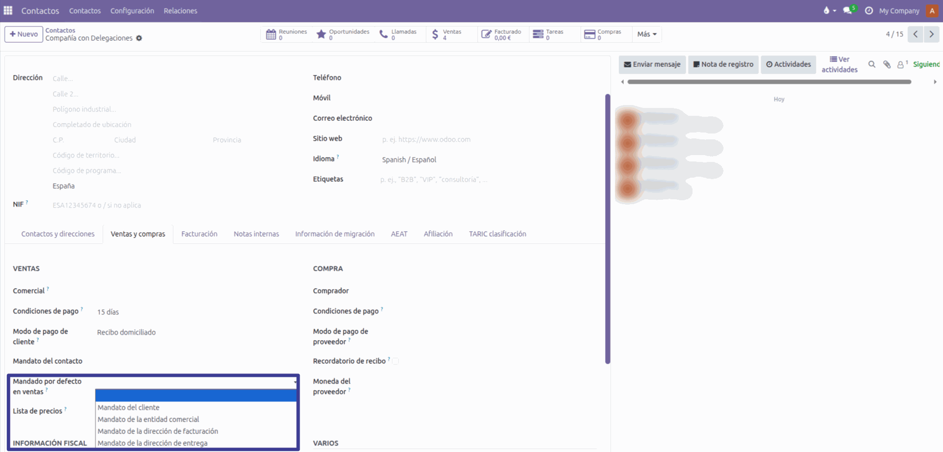 Podemos encontrar el campo “Mandato por defecto en ventas” dentro de la pestaña de “Ventas y compras” de cualquier contacto de tipo “Empresa” y definir el mandato bancario que se utilizará por defecto en los pedidos de venta de ese cliente.