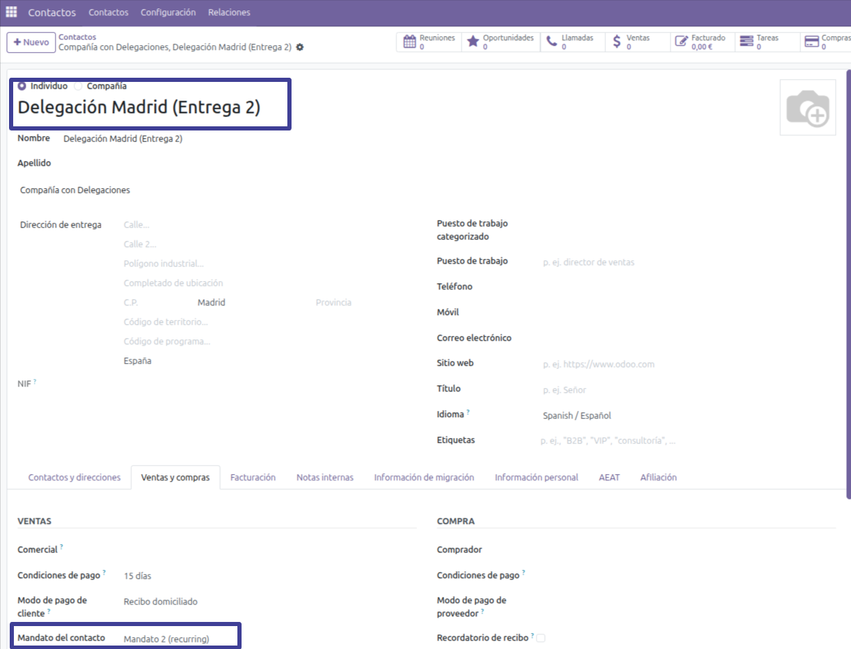 En el ejemplo, el cliente quiere que se entregue la mercancía en la Delegación de Madrid, y que se cobre la factura en el mandato que ha definido para ese contacto: