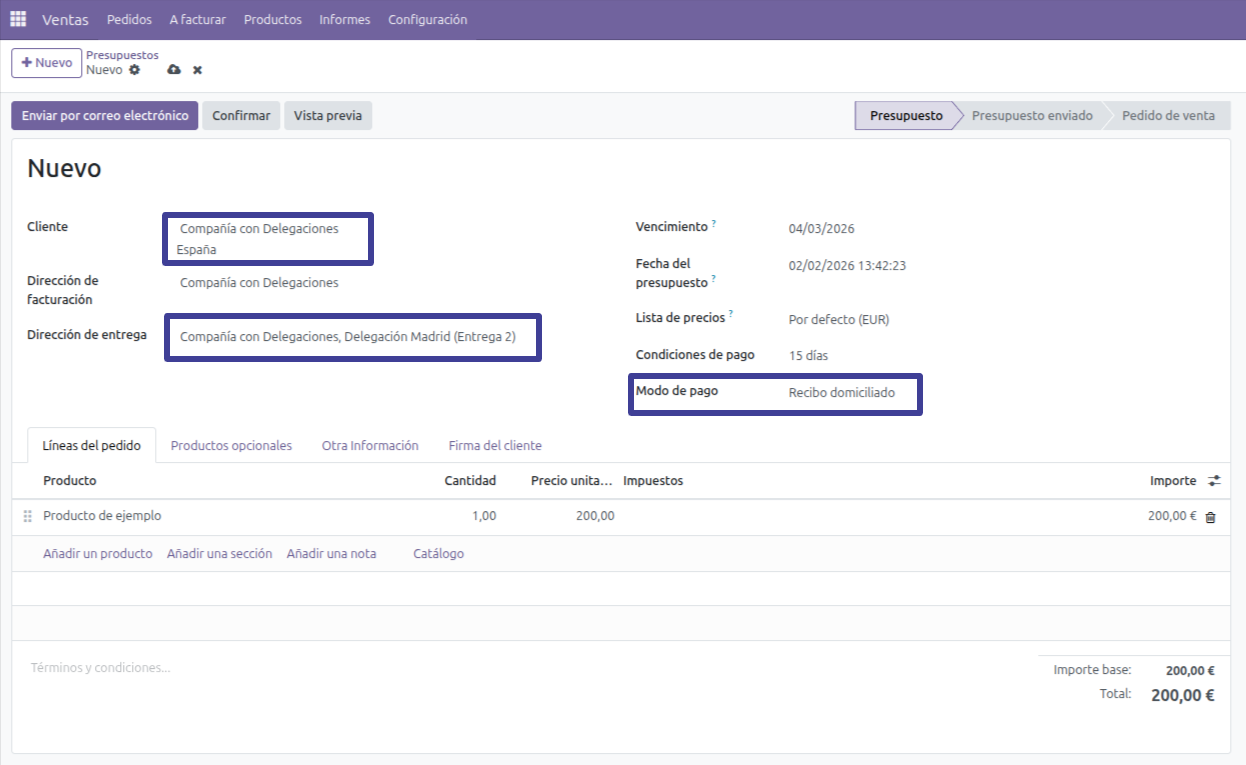 Ahora que hemos definido qué mandato bancario utilizará cada Dirección de entrega, crearemos el pedido de venta en la dirección que necesitemos. Cabe la pena recordar que será necesario que nuestro Odoo cuente con un Modo de pago que utilice el SEPA como Método de pago.