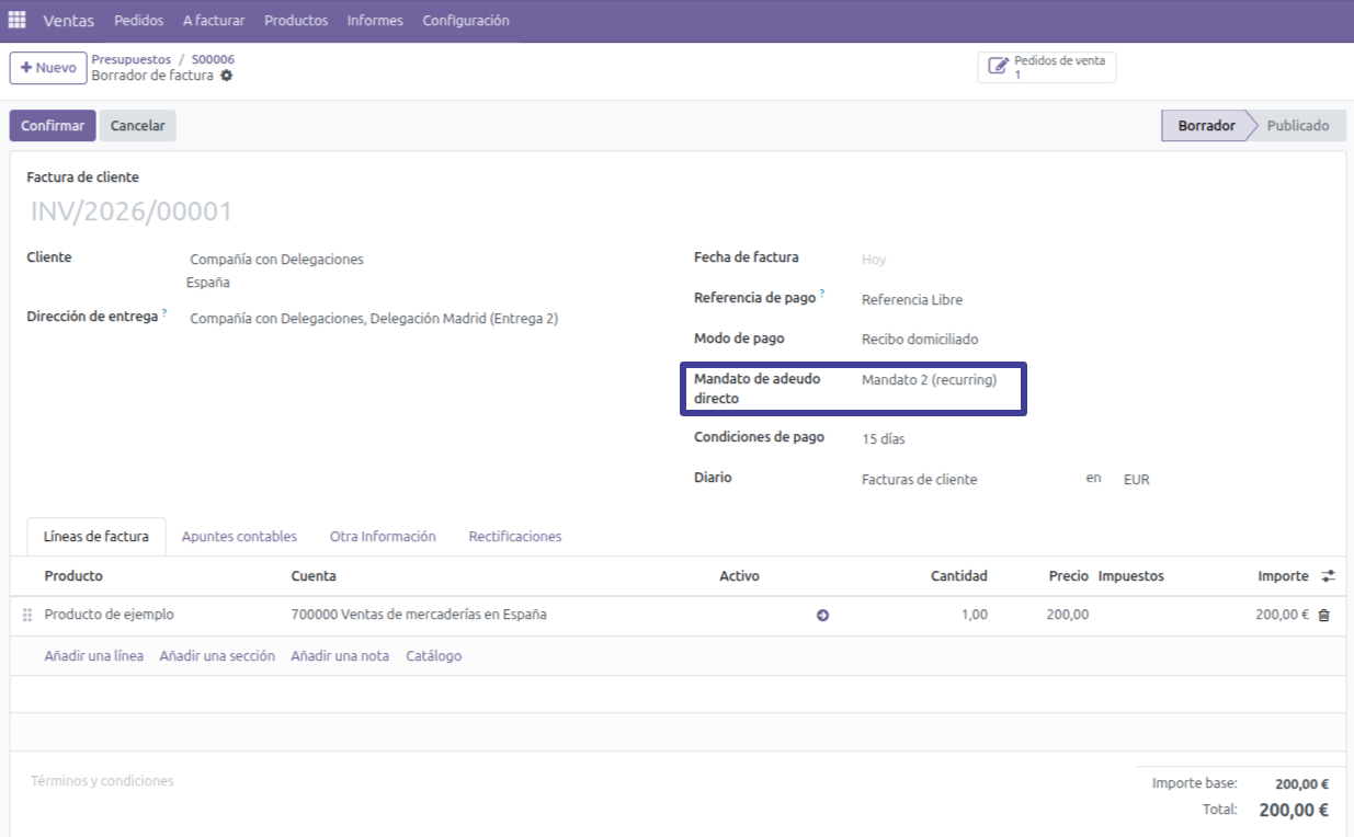 Tal y como hemos definido, gracias al módulo account_banking_mandate_sale_contact, la factura utilizará el Mandato 2, el cual habíamos definido en la Dirección de Entrega “Delegación Madrid (Entrega 2)".