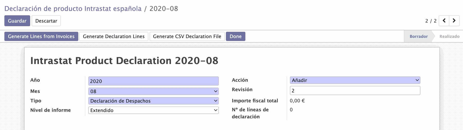 Para generar el informe, nos dirigiremos al módulo de Facturación/Contabilidad --> Informes --> Intrastat --> Declaración de producto Intrastat española. Una vez ahí crearemos nuestro informe con los datos siguientes: