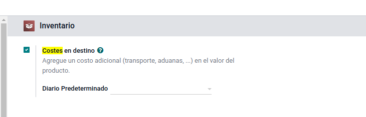 Al encontrarnos en la vista de opciones del inventario, deberemos buscar por la opción Costes en destino. Una vez activada, deberemos seleccionar también en qué diario deseamos que se registren estos costes indirectos. Ya activada la opción, podremos observar 2 cambios: