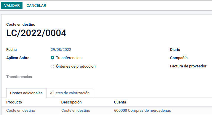 Una vez tengamos estos campos cumplimentados, deberemos validar el coste en destino.