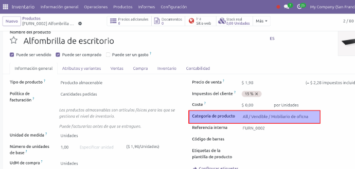 • Ruta: Inventario > Configuración > Categorías de producto.
