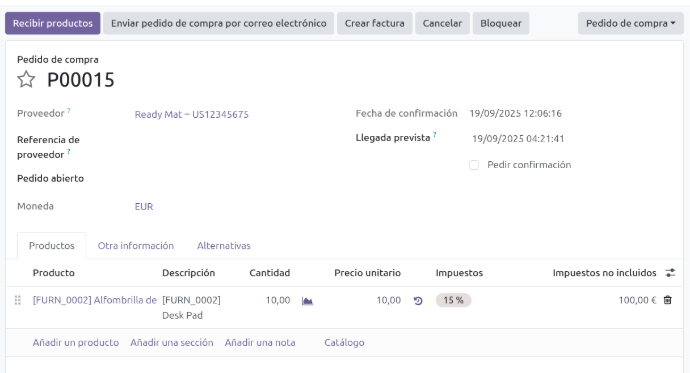 • Pedido P00015: 10 unidades a 10 €/ud.