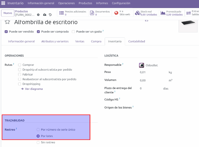 A continuación, realizaremos el flujo completo para validar la configuración en siete pasos. Partimos de un producto almacenable, con trazabilidad por lotes, asignado a una categoría con método de coste FIFO y estrategia de retirada FIFO.
