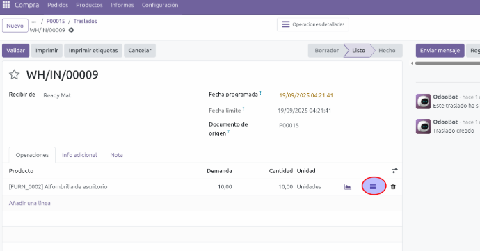 • En la línea del producto, hacer clic en Detalles / Lotes.