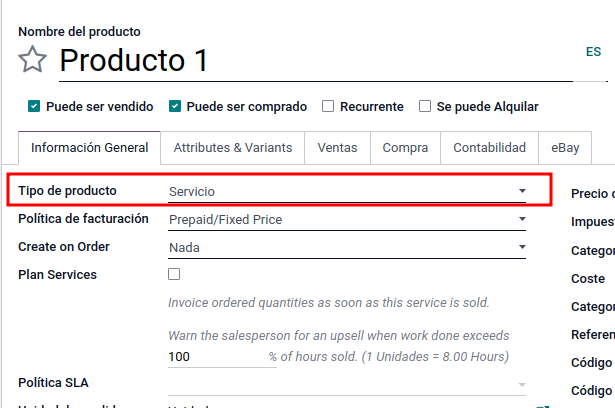 El producto en cuestión deberá de ser tipo servicio. De este modo podremos continuar con la configuración necesaria, de manera que al añadirlo a una venta y ésta se confirme, se genere un proyecto o un proyecto y sus respectivas tareas.