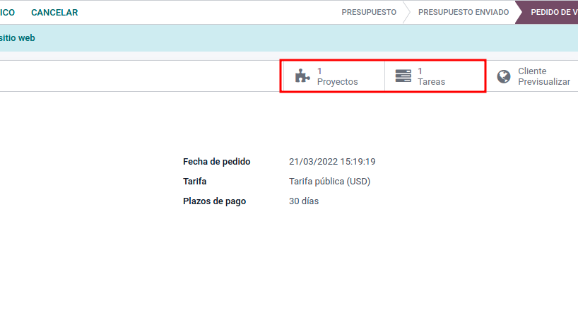 Podremos visualizar la información desde la venta, observando que aparece el campo Proyectos Tareas.
